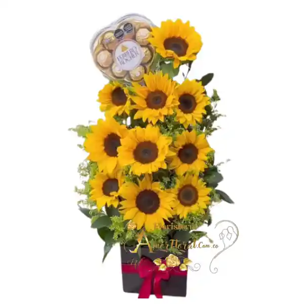 arreglos de 10 girasoles, chocolate ferrero corazon, si deseas un mensaje para la tarjeta lo puedes dejar escrito en el área de observaciones o escribirnos al whatsapp al 3143111616 y enviarnos el mensaje para la tarjeta.