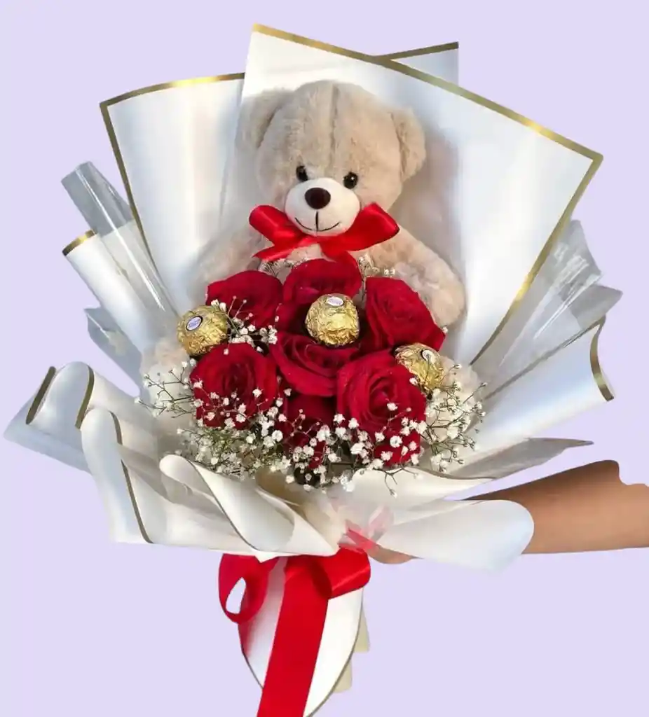 Contiene Un osito 7 rosas rojas 3 chocolates Follaje blanco Decoración Ramo de san Valentín Arreglo de san Valentín Ramo para mujer Arregló para mujer Ramo, feliz día