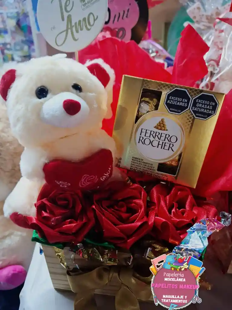 Arreglo rosa eterna por 3, incluye caja de chocolate roche x4, oso pequeño puede variar el color ,caja de madera y un lindo moño en tela ( incluye un pin decorativo de su preferencia).