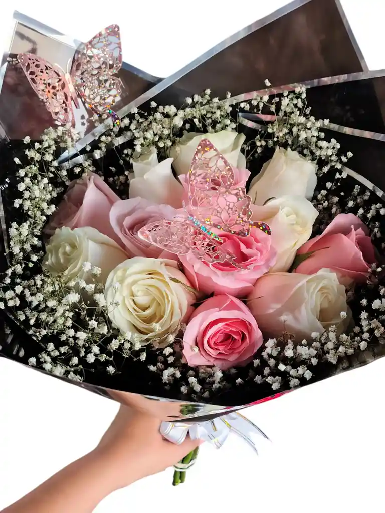 Buquet de 15 rosas, convinadas entre rosadas y blancas, con gipso, mariposas moño, papel coreano ( el color varia dependiendo de la disposición )
