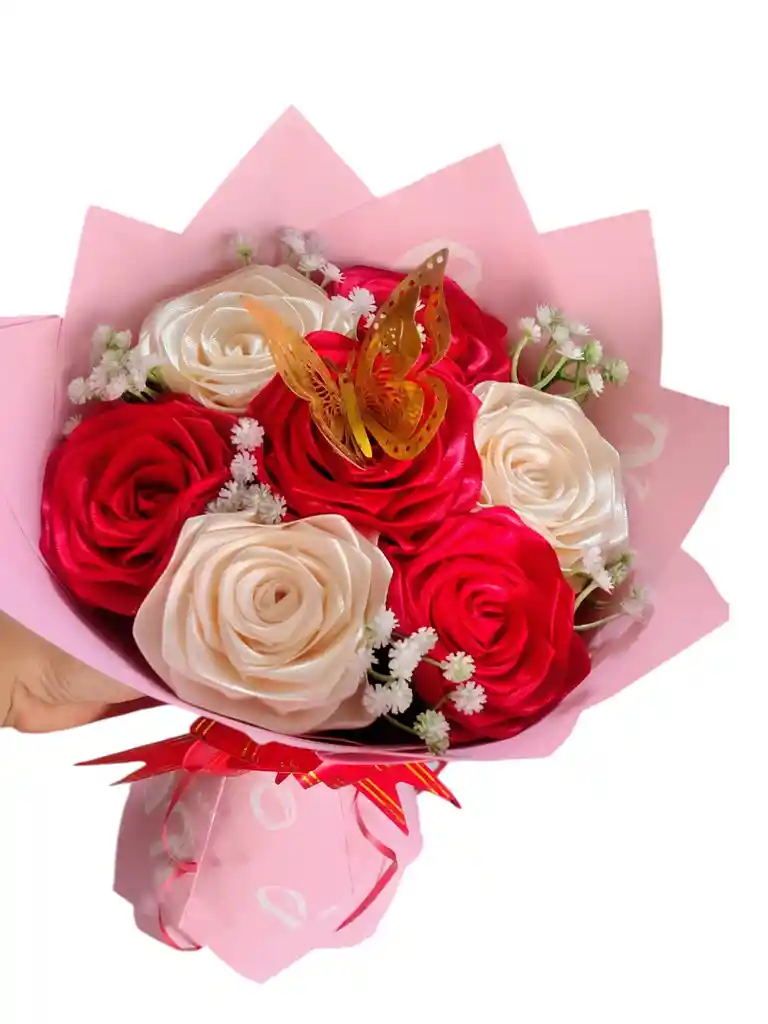 Buquet de 7 rosas roja y beige en tela, gipso artificial, mariposa, moño, papel coreano ( varia el color dependiendo de la disponibilidad )