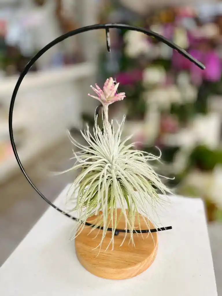 Arreglo de Tillandsia en Base de Madera con Soporte Metálico (pequeño) | Regalo Natural y Moderno a Domicilio Hermoso arreglo con Tillandsia natural (planta aérea), una planta única que no necesita tierra y simboliza libertad, equilibrio y energía positiva. Su follaje plateado y su delicada flor rosada la convierten en un detalle moderno, liviano y lleno de encanto natural. Viene presentada en una base circular de madera natural con soporte metálico negro, de diseño contemporáneo y minimalista, cuidadosamente armada y lista para regalar. Ideal para quienes buscan un regalo diferente, elegante y de fácil cuidado, perfecto para envío a domicilio. 🌸 Características del arreglo Tillandsia natural (planta aérea) Follaje plateado decorativo Floración rosada (según temporada) Base de madera natural incluida Soporte metálico negro de diseño moderno No requiere tierra Ideal para interiores 🎁 Perfecto para: Detalles especiales Regalos corporativos Decoración de interiores Regalos modernos y minimalistas Envíos de plantas y regalos vivos a domicilio 🌿 Cuidados del arreglo Luz: Luz indirecta brillante Riego: Pulverizar agua 2–3 veces por semana Ambiente: Interior, con buena ventilación Duración: Planta de larga duración y muy fácil mantenimiento Compra este arreglo de Tillandsia en base de diseño y recíbelo a domicilio con una presentación moderna y natural, ideal para sorprender con un detalle original y lleno de vida.