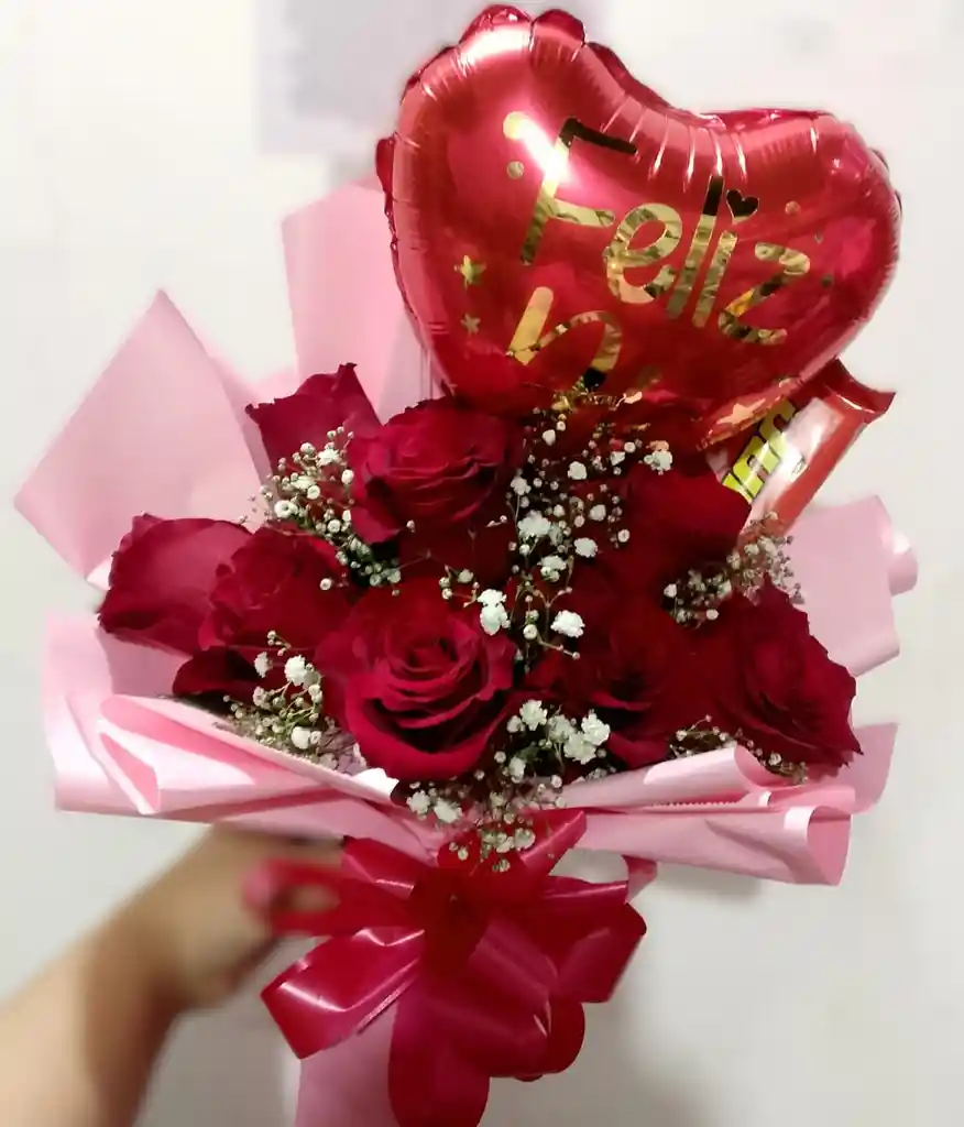 Arreglo elaborado de Rosas acompañado con Globo metalizado unicolor y chocolatina