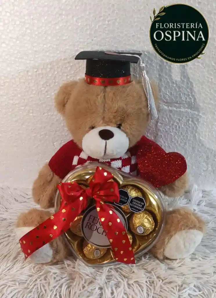 Un detalle que derrite corazones y celebra logros con dulzura. Nuestro Osito Dulce Graduación de Floristería Ospina es la forma más tierna de decir “Estoy orgulloso(a) de ti” con un toque romántico y coqueto. El suave osito luce su birrete con orgullo, sosteniendo un corazón brillante y una caja de Ferrero Rocher, símbolo de amor, ternura y celebración. ✨ Incluye: Peluche con gorrito de graduación. Caja de chocolates Ferrero Rocher en forma de corazón. Decoración con lazo rojo y detalles dorados. “Agrega una tarjeta personalizada al momento de la compra y deja que Floristería Ospina exprese tus sentimientos con un toque de ternura y amor.”