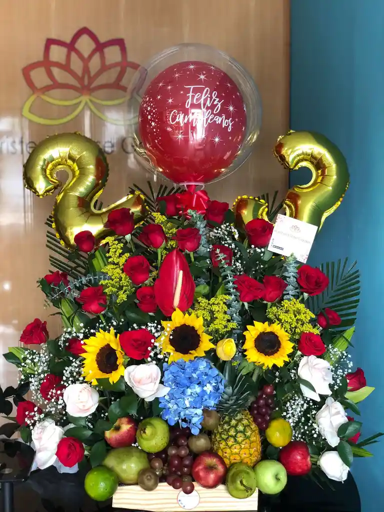 Arreglo En 24 Rosas Rojas + 6 Rosas Blancas + 3 Girasoles + 1 Hortencia + Frutas Exóticas Surtidas En Base De Madera+ Globos (opcionales)