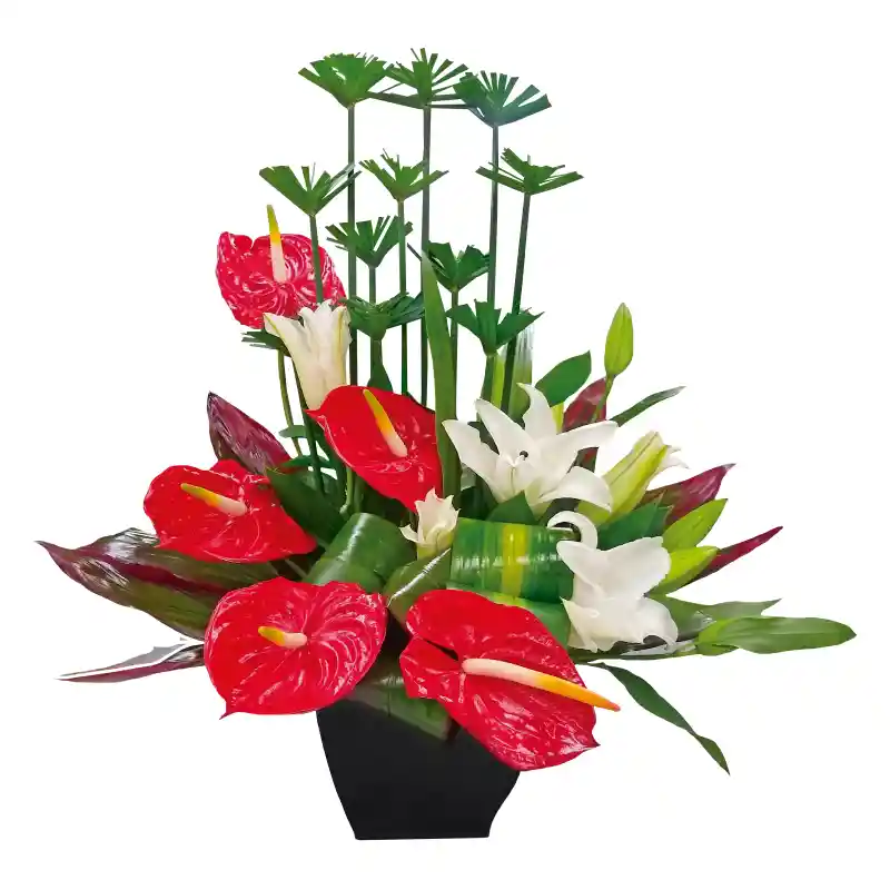 Anturios, papiros, lirios, y hoja de carey