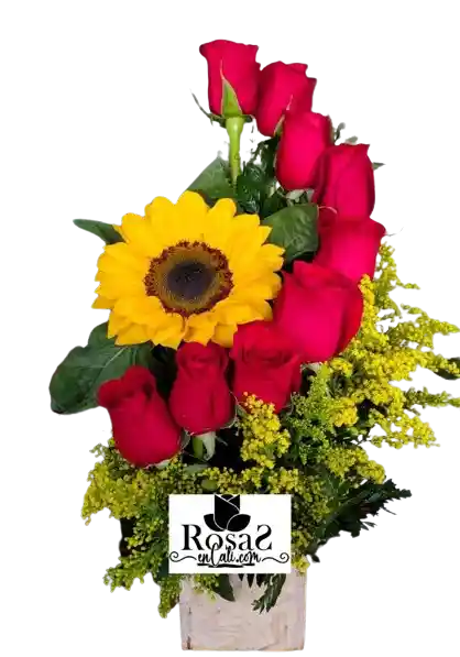 arreglo floral elaborado basé de madera, rosas fucsias, girasol y follaje. si deseas algún mensaje para tarjeta lo puedes dejar escrito en el área de observaciones o escribirnos vía WhatsApp al 3172528979