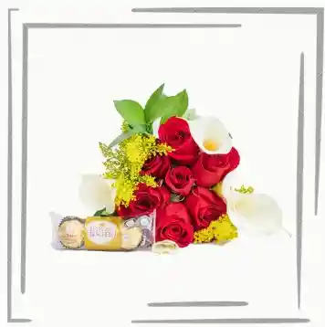 Bouquete de 9 rosas, 3 cartuchos, follaje, choclates ferrero x 3 unidades con envoltura decorativa. El mejor regalo para cualquier ocasión, incluye tarjeta personalizada con el mensaje que desees (escribir en el chat)