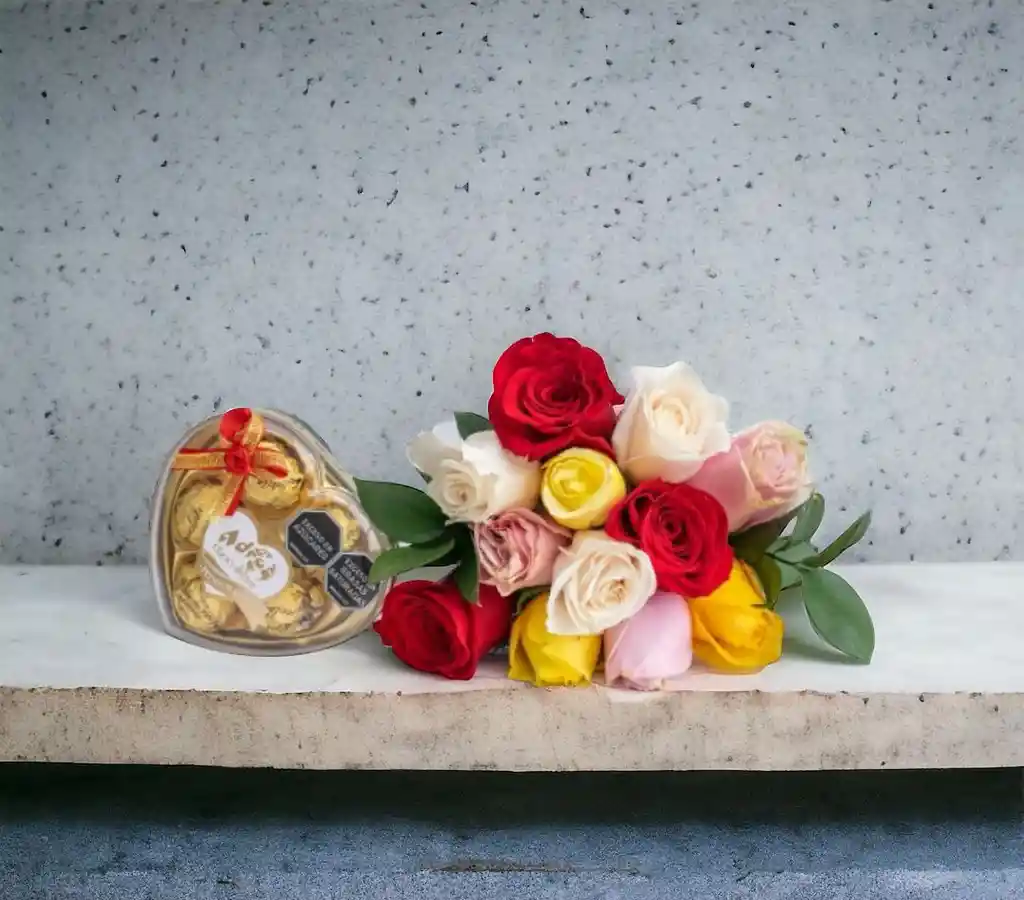 Bouquet de rosas surtidas en combo con chocolates de 5 unidades, largo 40 cm, con envoltura decorativa. El mejor regalo para cualquier ocasión, incluye tarjeta personalizada con el mensaje que desees (escribir en el chat) de color Multicolor ideal para el Felicitaciones