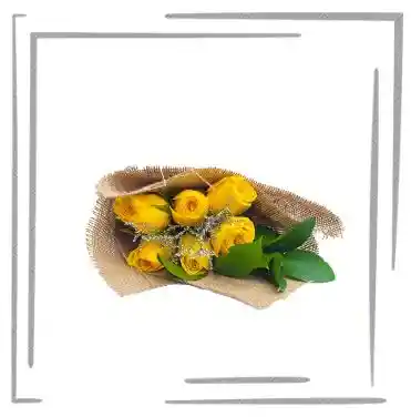 Bouquet de 6 rosas amarillas, tipo exportación, largo 40 cm con follaje y envoltura decorativa.