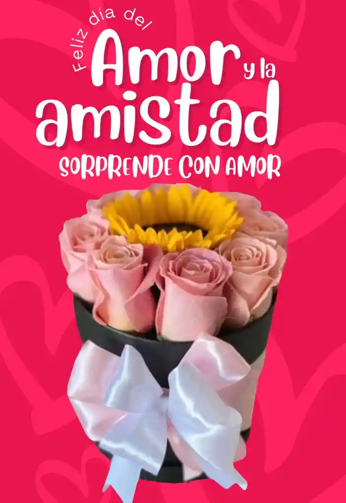 ARREGLO CON ROSA ROSADA GIRASOL CAJA REDONDA MOÑO TARJETA PERSONALIZADA