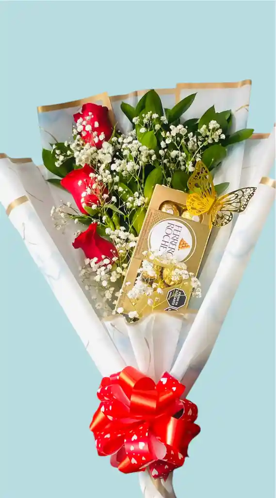 contiene 3 rosas rojas caja de chocolates ferreros x 8 decoración tarjeta personalizada