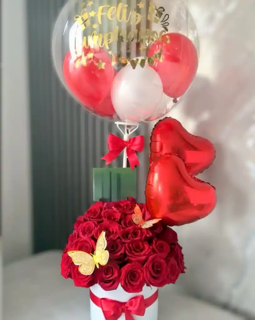 Contiene 48. Rosas Rojas. Dos globos de corazón Globo, feliz día o feliz cumpleaños Mariposas, decorativas Decoración Tarjeta personalizada