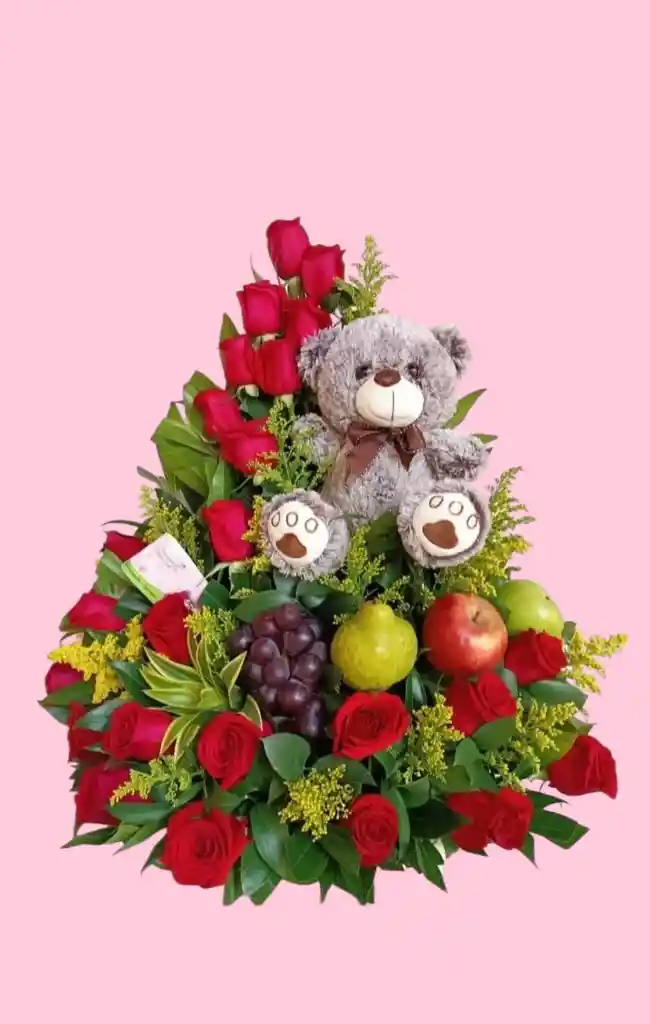 Contiene 24 rosas Rojas Follaje verde Oso de Peluche Frutas Uvas Manzana verde Manzana roja Pera Decoración Tarjeta personalizada