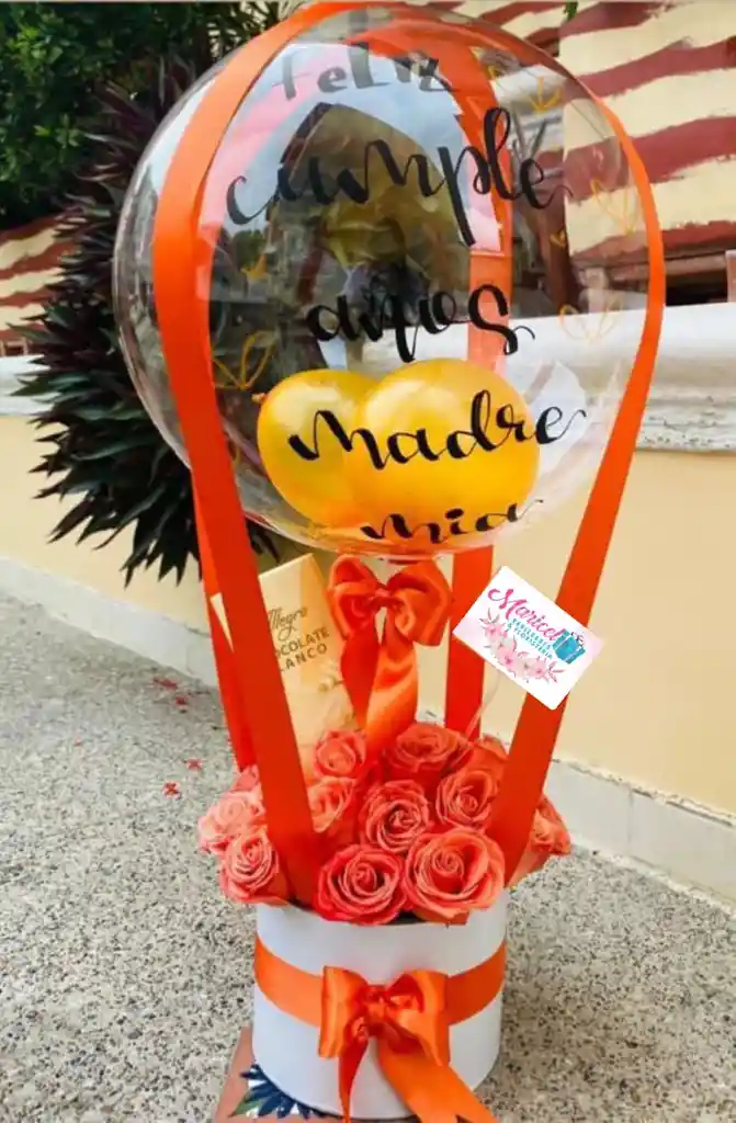 Arreglo Floral elaborado en Rosas Con caja Cilindro y Globo burbuja