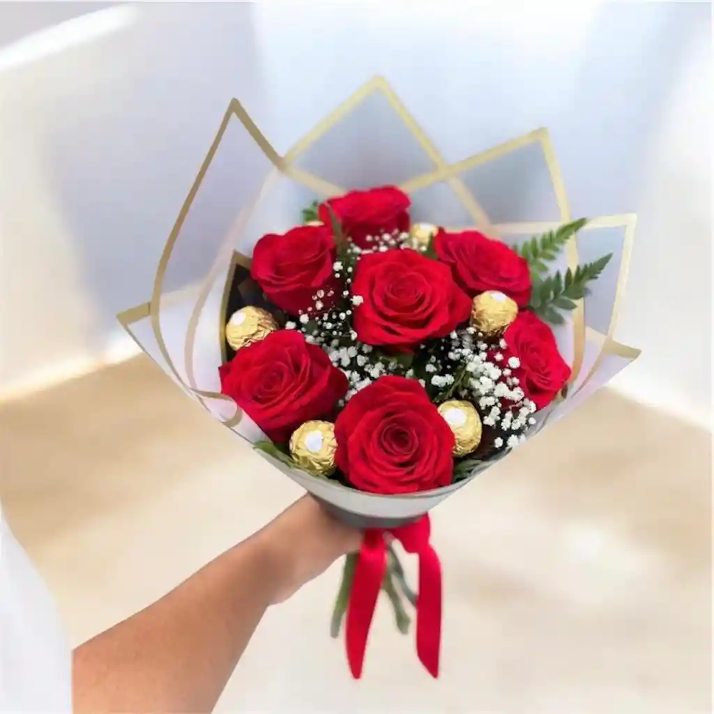 Contiene Siete rosas rojas Seis chocolates Follaje Decoración Tarjeta personalizada