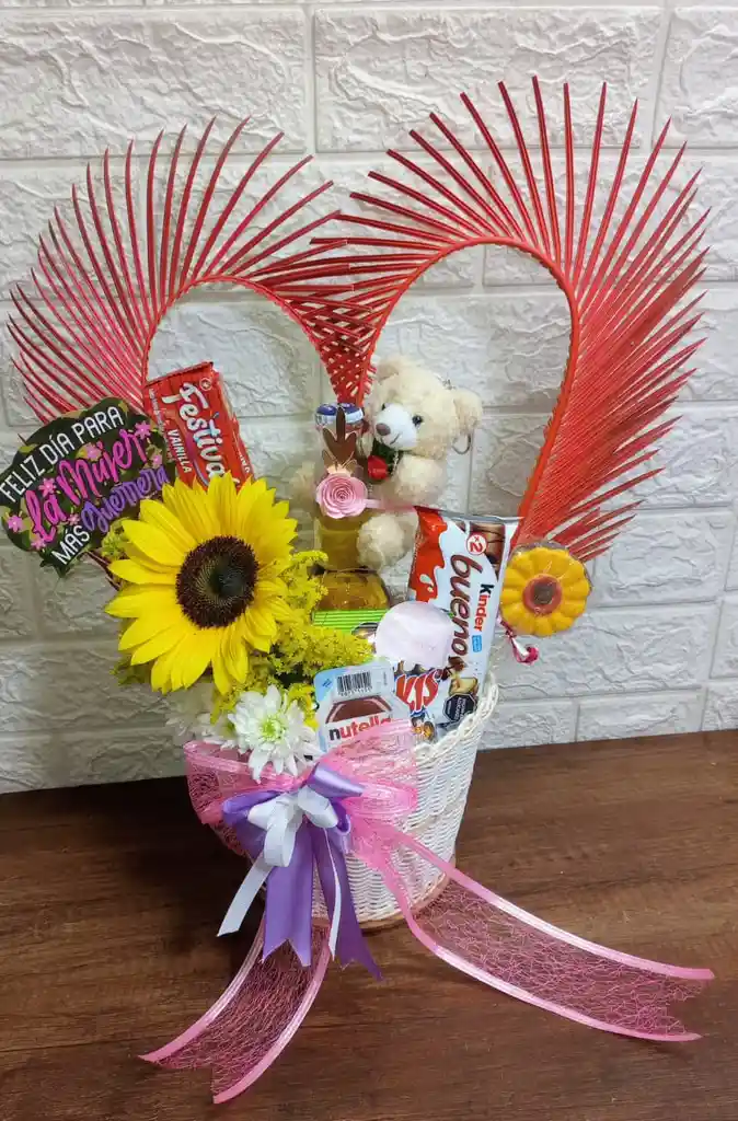 arreglo floral con peluche y chocolates