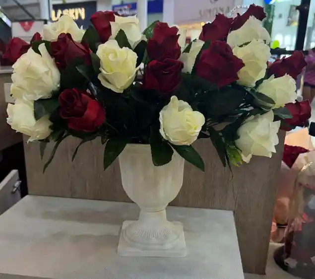 Símbolo eterno del amor, presentamos este hermoso arreglo floral con rosas rojas y blancas en un jarrón blanco, ideal para ocasiones especiales o decorar tus espacios con distinción y elegancia.