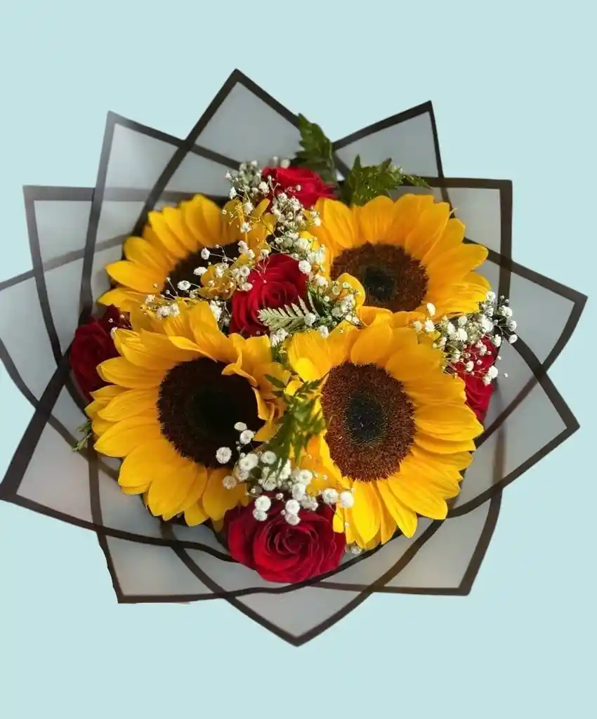 Contiene 4 girasoles 5 rosas Rojas Follaje Decoración Tarjeta personalizada