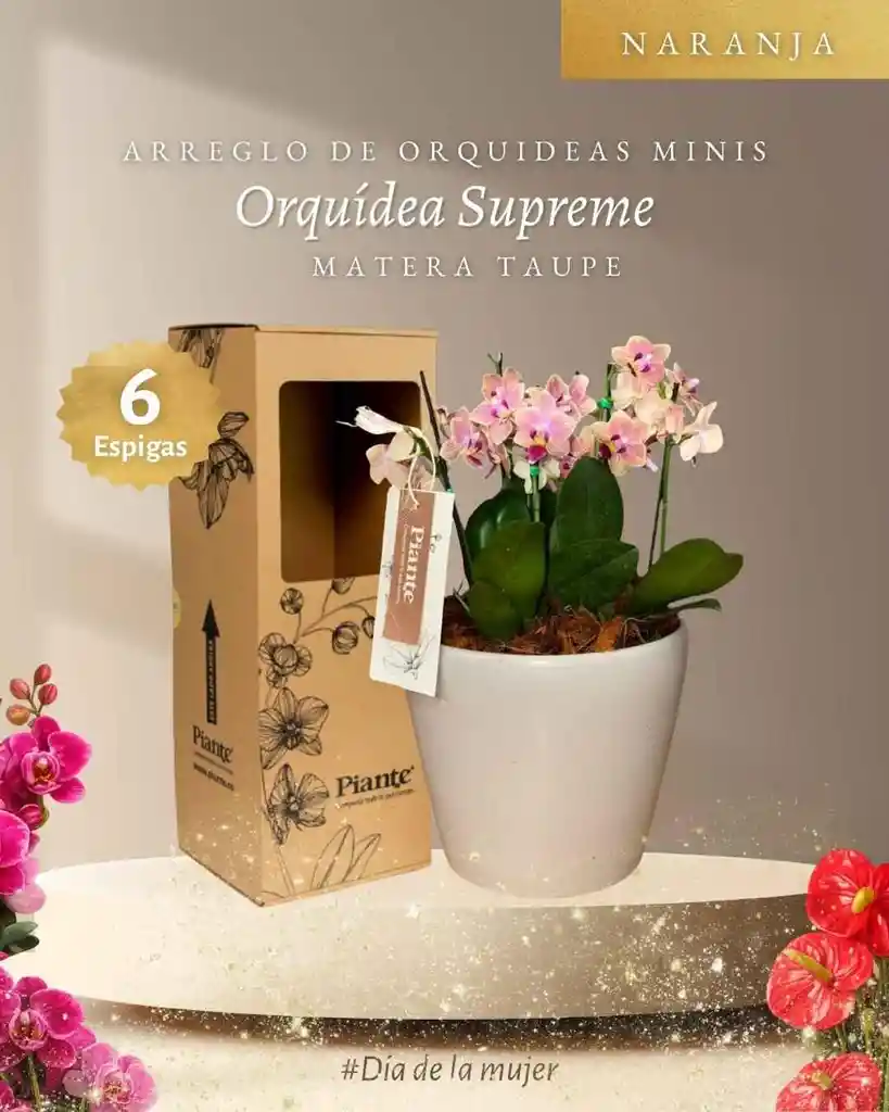 Un detalle con estilo para San Valentín: este arreglo de orquídeas mini combina elegancia y buen gusto, ideal para ambientar salas, oficinas o escritorios con un toque natural y sofisticado. Es un regalo que destaca sin exagerar, transmite intención y sorprende por su belleza, calidad y duración. Es un arreglo de orquídeas en sustrato de coco PIANTE con 6 espigas florales, con altura promedio de 25 cm y duración estimada de 3 a 4 meses según cuidados (son plantas vivas). Incluye nota de cuidados y dedicatoria personalizada, perfecto para una experiencia completa. Matera en cerámica tipo importación, diámetro 18 cm, color taupe. Foto de referencia. Puede variar en tamaño y/o coloración según el estado de floración."