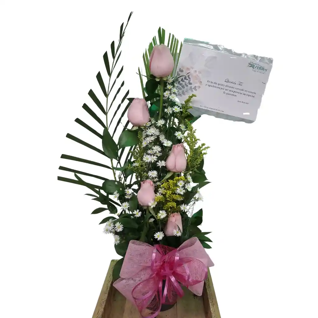 Hermoso arreglo floral de rosas rosadas en base de cristal, con moño decorativo, perfecto para toda ocasión.