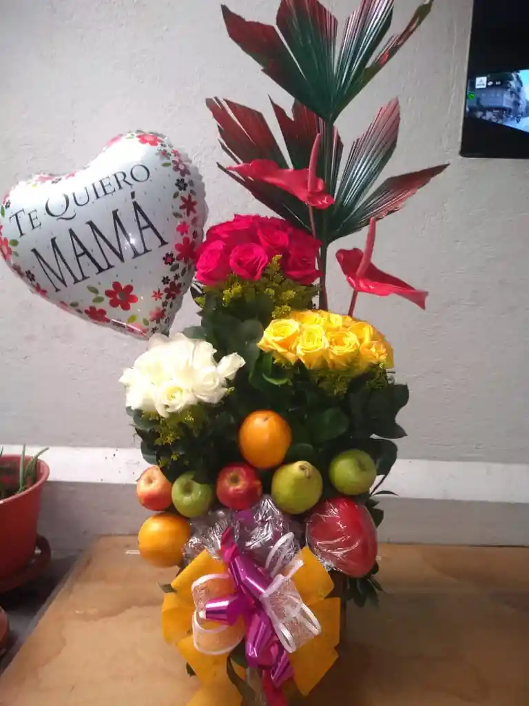 Arreglo Floral de Rosas Variadas, Globo y Frutas