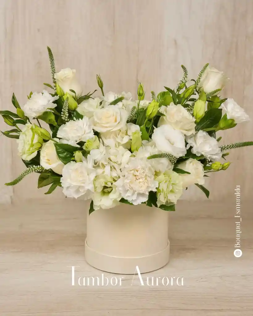 Un diseño que transmite calma, pureza y elegancia. Este delicado tambor floral combina 6 rosas con un mix sobrio y armonioso que puede incluir lisianthus, clavel importado, verónicas, hojas de eucalipto y hoja de dólar, siempre sujeto a disponibilidad. Todo dispuesto en una elegante caja redonda beige que realza su serenidad natural. Un detalle perfecto para expresar gratitud, celebrar momentos especiales o regalar un gesto lleno de intención.