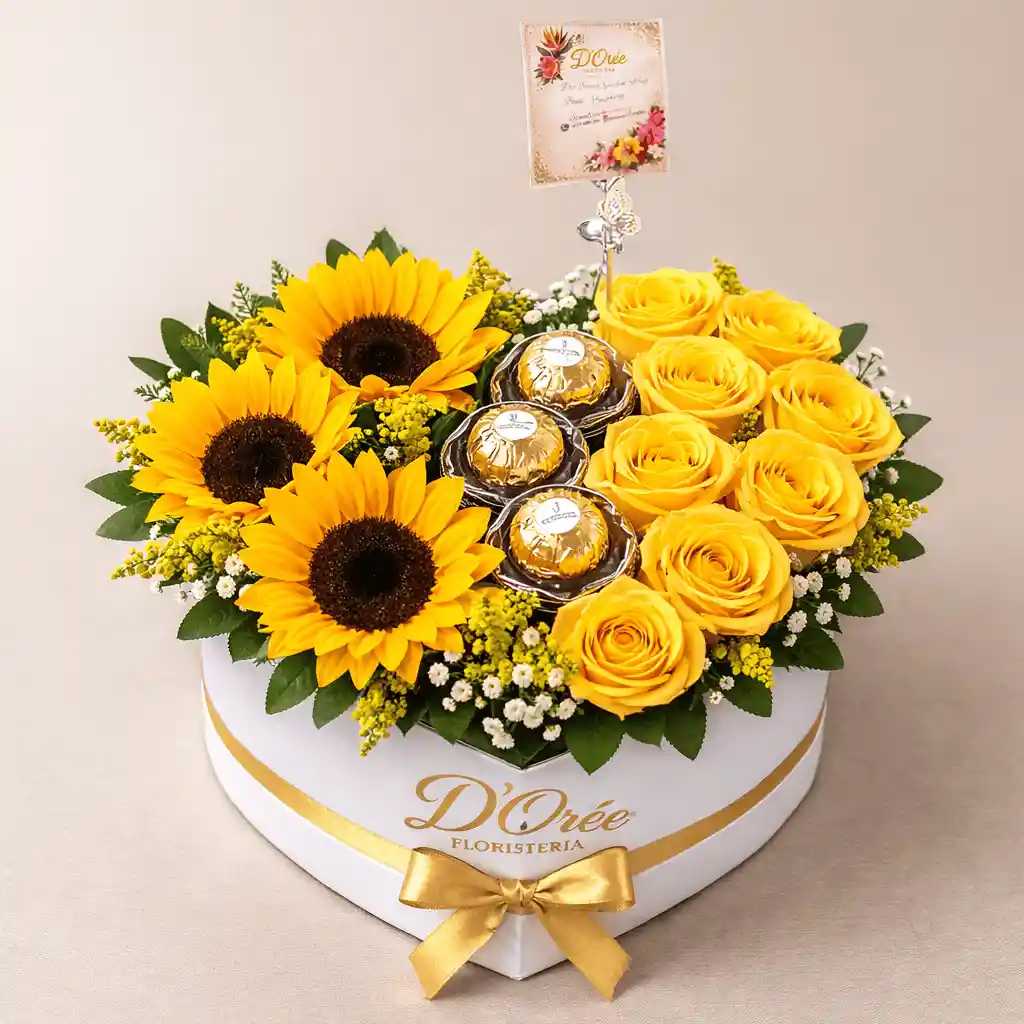 Sorprende con este hermoso y delicado arreglo en caja con forma de corazón, perfecto para expresar amor, alegría y ternura en cualquier ocasión especial. Incluye: ✨ 4 girasoles frescos que transmiten luz, energía y felicidad 🌹 Rosas amarillas elegantes que simbolizan amistad, cariño y buenos deseos 🌿 Follaje verde y detalles en blanco que realzan su belleza natural 🍫 3 chocolates Ferrero Rocher en cápsulas transparentes para un toque dulce y sofisticado Diseñado en una elegante caja blanca en forma de corazón, ideal para cumpleaños, aniversarios o para alegrarle el día a alguien especial. 💝 Un detalle único, moderno y lleno de significado que enamora a primera vista.