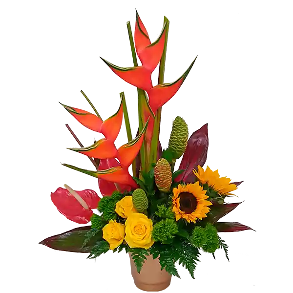 Arreglo en mracas, heliconias, girasoles, rosas, anturios, grimbol, helecho, hoja de carey. color Amarilla perfectas para el Agradecimiento