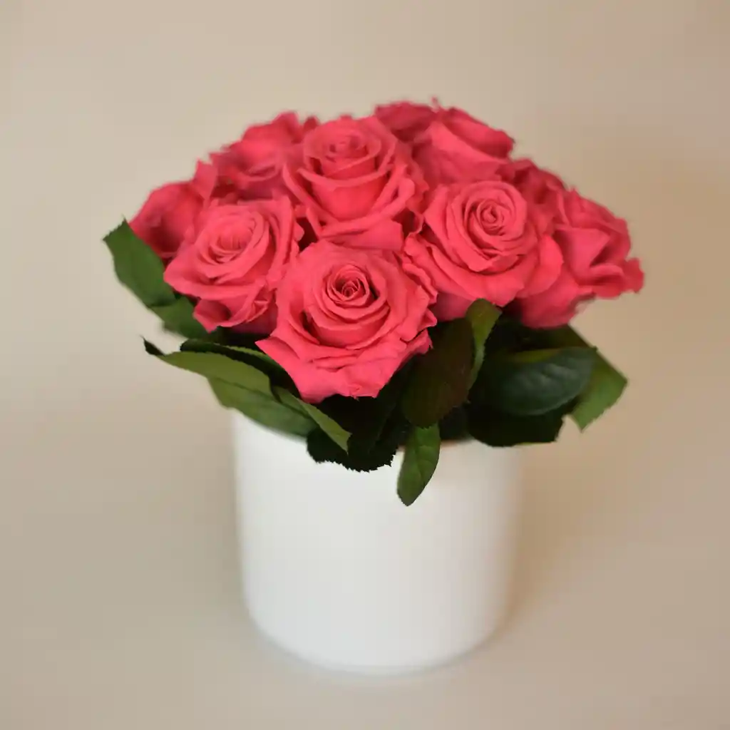 Arreglo floral con rosas eternas en florero de cerámica. Ideal para regalar en cualquier ocasión.