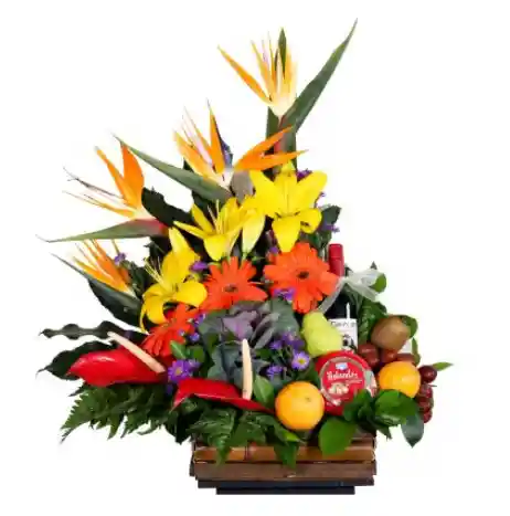 Arreglo en base de bambu, aves de paraiso, lirios, gerberas, anturios, coles, 2 clases de follajes, 5 clases de fruta diferentes, 1 vino gato negro, queso olandes y tarjeta.
