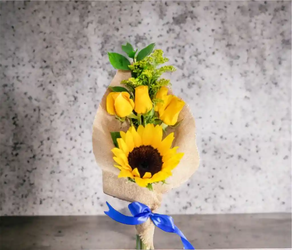 4 Rosas amarillas tipo exportación y un girasol, 30 cm de largo, incluye decoración y tarjeta (indicar en el chat que mensaje desea)