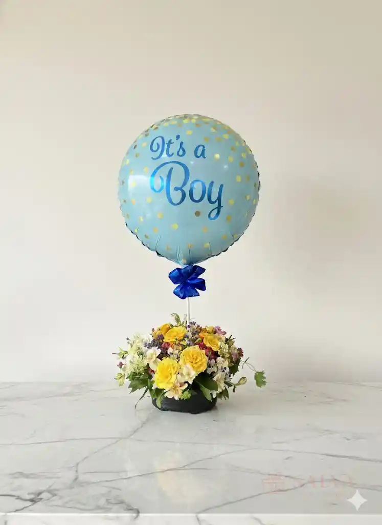 Hermoso arreglo floral para dar la bienvenida a un niño, elaborado con una alegre selección de flores tropicales variadas como mini rosas, rosas, astromelias y otras variedades, creando una composición colorida y llena de vida. Incluye globo “It’s a Boy” y tarjeta con mensaje personalizado, ideal para celebrar este momento tan especial y expresar cariño a la familia. ✔ Flores frescas y tropicales de alta calidad ✔ Incluye globo decorativo “It’s a Boy” ✔ Tarjeta con mensaje personalizado ✔ Ideal para nacimiento, baby shower o bienvenida al bebé