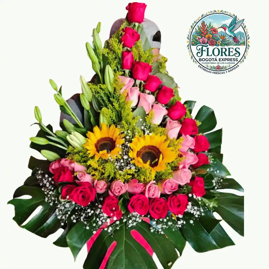 Espectacular arreglo floral que combina la intensidad de las rosas rojas y rosadas con la alegría vibrante de los girasoles, complementado con delicados lirios y finos follajes verdes. Su diseño en forma triangular aporta elegancia y presencia, convirtiéndolo en un detalle ideal para celebraciones especiales, cumpleaños o para transmitir admiración y cariño. Una composición llena de vida, color y armonía que ilumina cualquier espacio y ocasión.