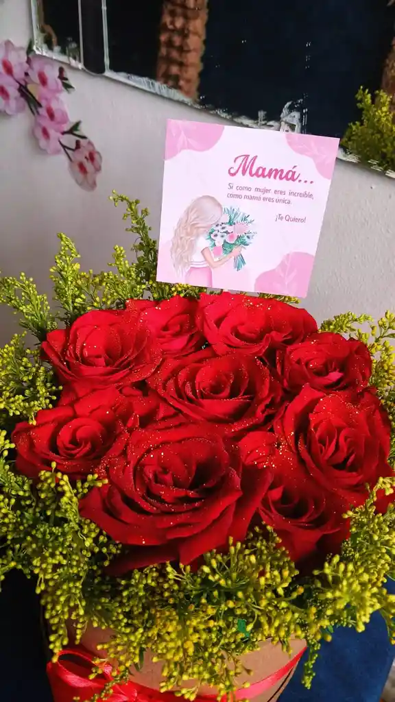 Arreglo floral en cilindro con 9 rosas y tarjeta personalizada. Ideal para un hermoso detalle en el dia de la madre, cumpleaños, aniversario u otra ocasion.