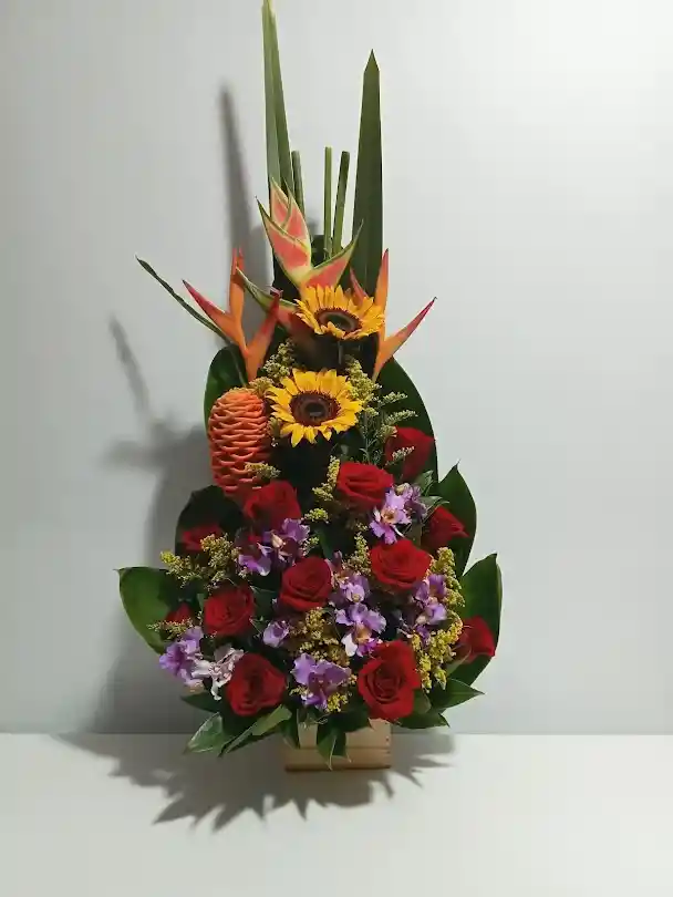 lindo arreglo floral piramideheliconia, pajaritos, maraca, girasoles, rosas, follaje, hojas de lino, tarjeta