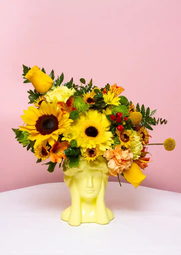 Este es un vibrante y alegre centro de mesa floral que presenta una explosión de tonos amarillos, dorados y anaranjados, con un estilo que evoca la calidez del sol. El arreglo está compuesto por una rica variedad de flores, incluyendo grandes girasoles de centros oscuros, rosas amarillas, gerberas, claveles anaranjados y amarillos, y flores de acento en verde lima y amarillo mostaza, además de pequeños racimos de bayas rojas y follaje verde frondoso. Lo más distintivo del arreglo es el recipiente: un jarrón de cerámica de color amarillo pálido con forma de cabeza o rostro femenino con cabello rizado, lo que le da un toque moderno, escultórico y muy artístico, haciendo de este un centro de mesa verdaderamente único y lleno de personalidad.