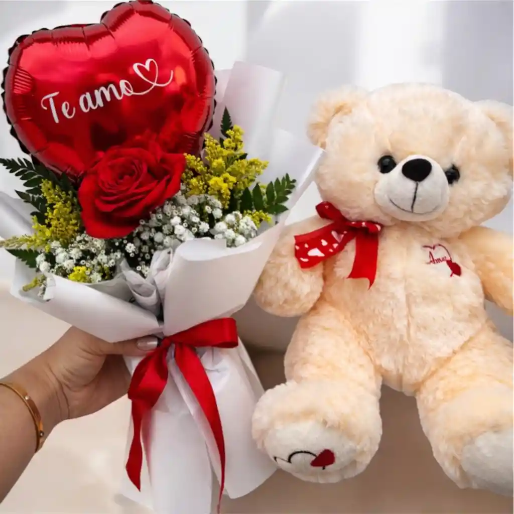 Contiene 1 rosa, roja globo de corazón con frase. Te amo. follaje, amarillo Follaje blanco Oso de Peluche Decoración Tarjeta personalizada ETIQUETAS DE BUSQUEDA Ramo de flores Ramo de rosas Bouquet de flores Bouquet de rosas Arreglo floral Arreglo de flores con rosas rojas y peluche Ramo de flores con rosas rojas Ramo de rosas rojas