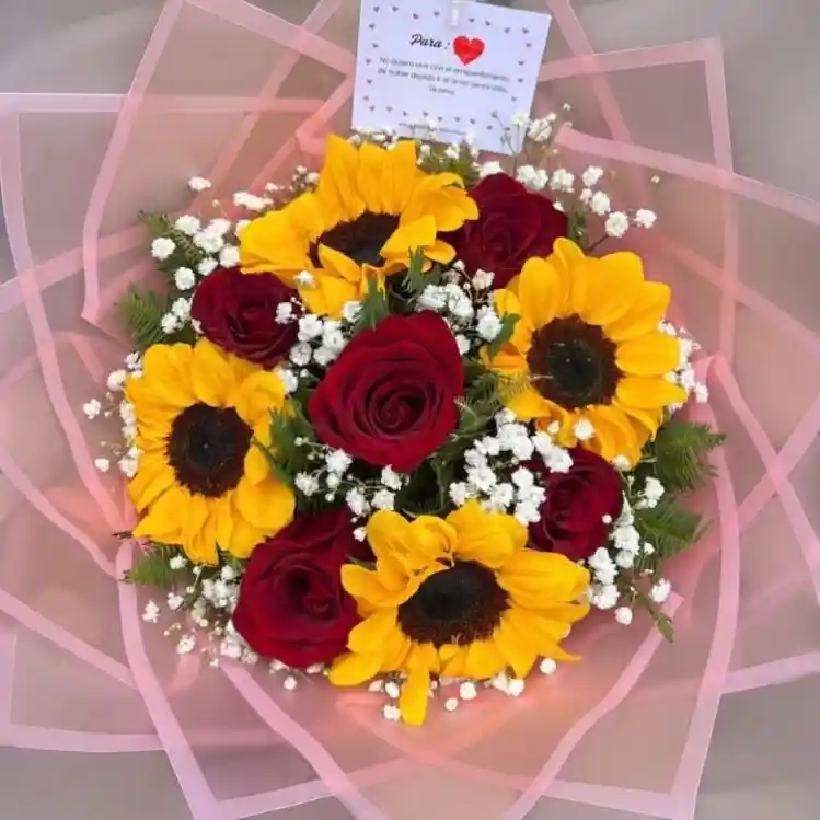 Contiene 4 girasoles 5 rosas Rojas Follaje Decoración Tarjeta personalizada