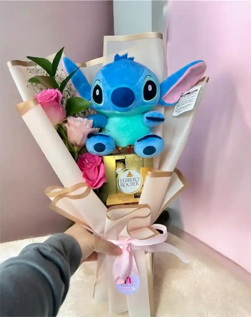 contiene Peluches Stitch azul 3. Rosas. Caja de chocolate x4 Follaje Decoración Tarjeta personalizada