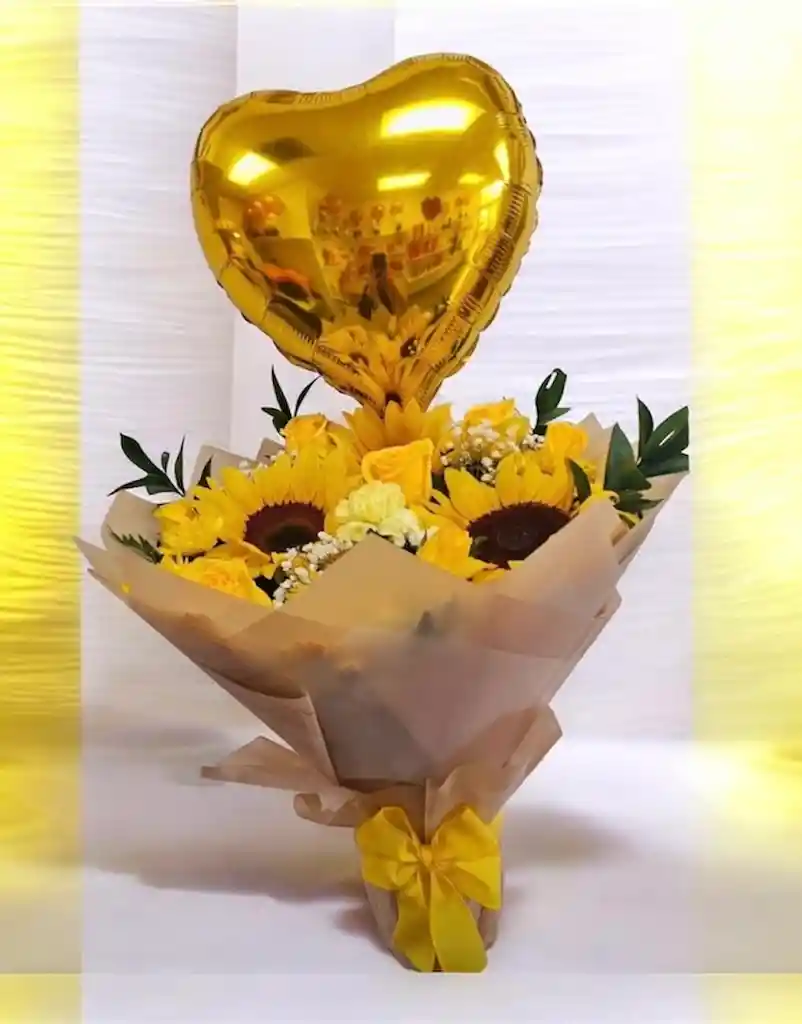 Contiene 5 girasoles Rosas amarillas claveles o margaritas Follaje Globo de corazón Decoración Tarjeta personalizada