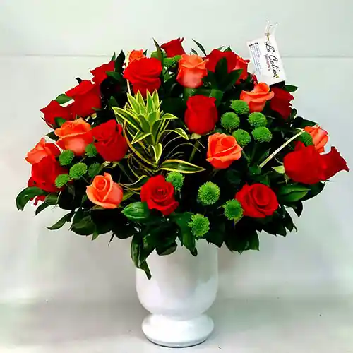 Arreglo floral redondo con rosas: Elaborado sobre una base blanca con 36 rosas tipo exportación para regalar en ocasiones especiales como Amor y Amistad, Aniversario o Porque sí.