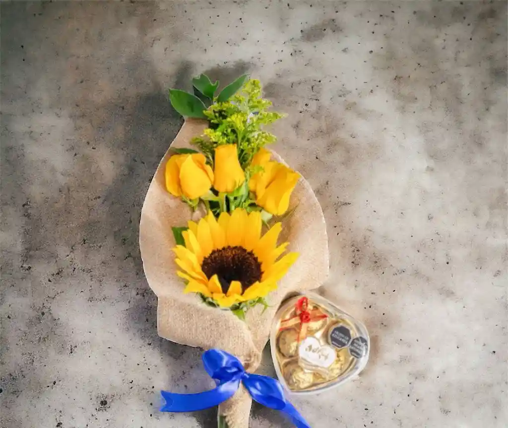Bouquet de 1 girasol, 4 rosas amarillas y paquete de chocolates de 5 unidades, largo 40 cm, con envoltura decorativa.