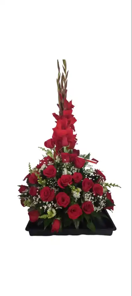 En caja de madera se elabora con una docena de Rosas Rosas lindo y sencillo arreglo floral, puede varias gladiolo rojo o heliconia, con follajes varios,