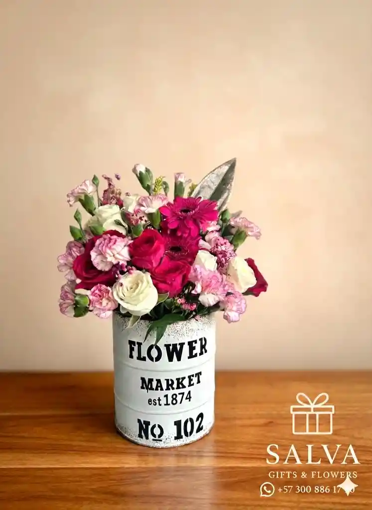 Hermoso arreglo floral elaborado con una cuidada selección de gerberas, claveles, mini rosas y otras variedades de flores, presentado en una elegante base de latón que aporta un toque sofisticado y decorativo. Ideal para regalar o embellecer cualquier espacio con estilo y frescura. (Los colores de las flores pueden variar según disponibilidad, conservando siempre la calidad y la elegancia del arreglo.) ✔ Flores frescas y seleccionadas ✔ Base de latón decorativa y resistente ✔ Diseño elegante y versátil ✔ Perfecto para ocasiones especiales o decoración