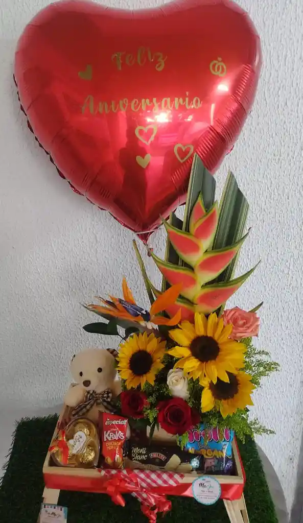 hermosa anchetya en base de madera con chocolates baileys,gomitas ,mani ,peluche rosas ,girasoles ideal para toda ocasion ,