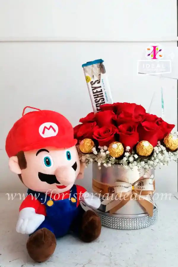 Lindo arreglo floral de rosas rojas, montado en caja premium circular acompañado de hermoso follaje, deliciosos chocolates Ferrero Rocher, Hershey´s y peluche de Mario.