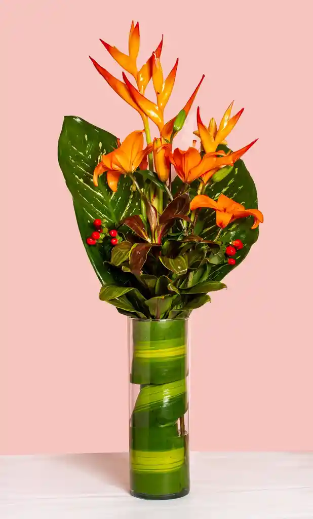 Este es un llamativo y vibrante arreglo tropical presentado en un jarrón cilíndrico de cristal, cuya base está decorada internamente con hojas verdes envueltas que crean un elegante patrón rayado. La composición se centra en la espectacularidad de las flores naranjas y puntiagudas, probablemente Heliconias o Ave del Paraíso, que aportan altura y una estructura exótica. Estas flores están realzadas por una gran hoja de follaje manchado y salpicado que sirve de contraste y dramatismo, y se complementan con un follaje oscuro en la base y pequeños toques de bayas rojas brillantes, dando como resultado un diseño audaz, moderno e ideal para evocar la exuberancia de la naturaleza.