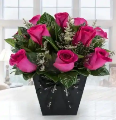Elaborado en 6 rosas (colores disponibles: rojas, rosadas, amarillas, blancas) follaje, alimento floral, base de madera, y tarjeta. personaliza tu mensaje de la tarjeta escribiendonos en la seccion de comentarios.