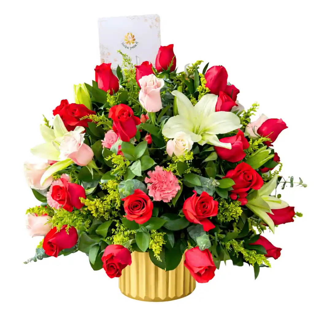 Un diseño floral de gran presencia, creado para transmitir amor, elegancia y admiración en cada detalle 🌹✨. Este imponente arreglo incluye una base redonda con 50 rosas frescas, combinadas con lirios imponentes y follaje natural, logrando una composición armoniosa y sofisticada. Puedes elegir el color de las rosas según la ocasión, haciendo de este regalo una expresión única y memorable. Si nos envías tu mensaje, te obsequiamos una tarjeta personalizada 💌. REF: BOX12